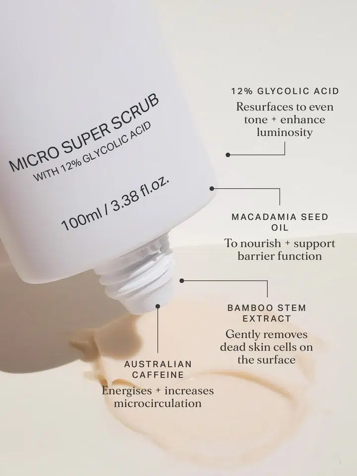 Microdermabrasie in een tube! Deze zeer fijne scrub en peeling in één met 12% glycolzuur en biologisch afbreekbare scrubdeeltjes van bamboe extract verwijdert dode huidcellen, stimuleert de doorbloeding en egaliseert en verfrist de teint.